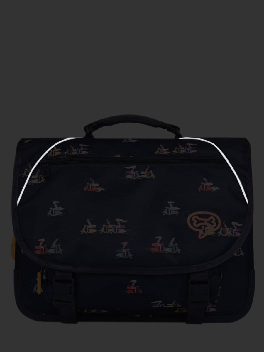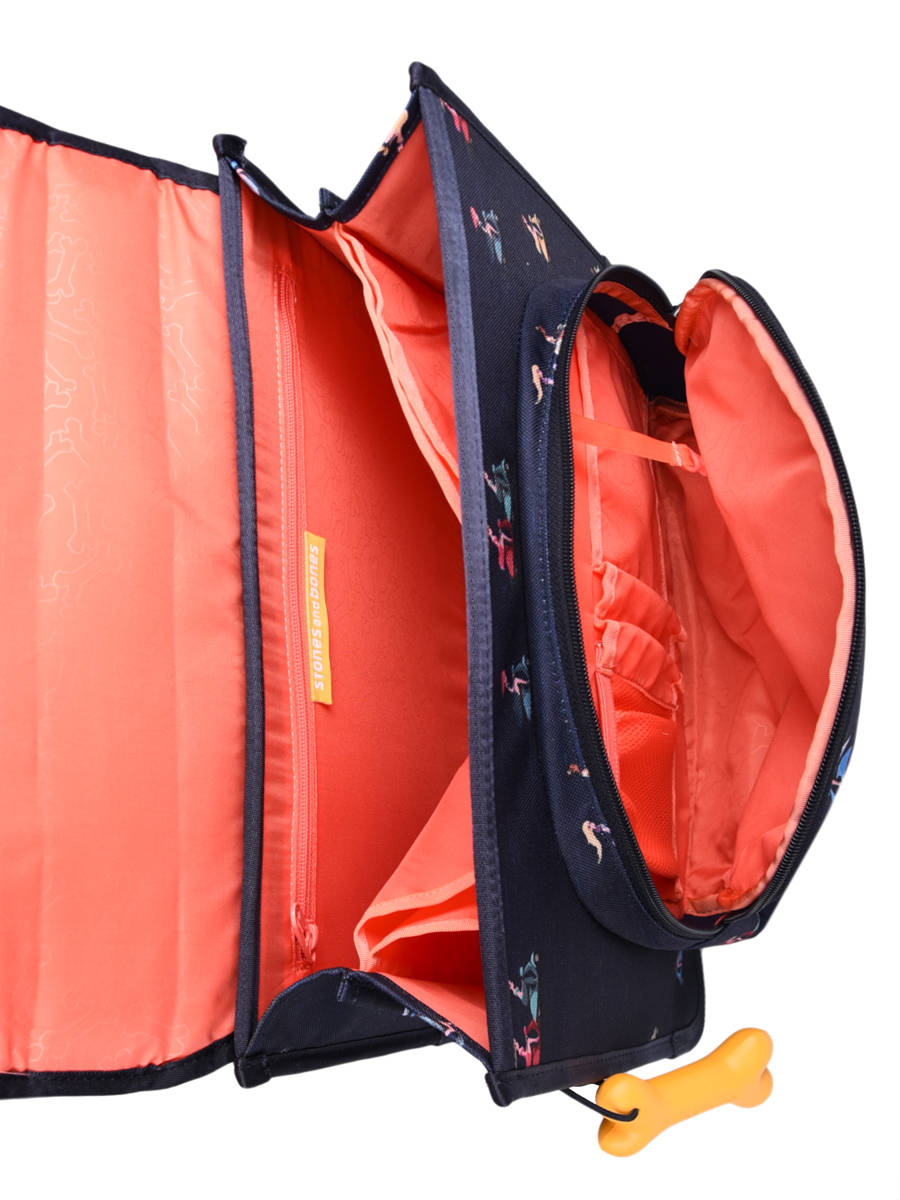 38 cm - 13 litres - 0.88 kg ~ Cartable fille 38 cm de la marque Stones and Bones. Ce cartable enfant est idéal pour le CP, CE1 et CE2. Il se divise en deux compartiments et peut contenir les formats cahiers A4 et 24x32cm. On retrouve à l'intérieur une petite poche à fermeture zippée. Pratique, il dispose de deux poches à fermeture éclair sur le devant (sous et sur le rabat), idéales pour un petit goûter ou l'agenda. Petit plus, ce cartable dispose d'une étiquette nom. Le fond et les angles du cartable sont renforcés pour plus de solidité et des bandes réfléchissantes sont disposées autour du sac et sur les bretelles. Conçu pour le confort des enfants, le dos et les bretelles sont rembourrés.